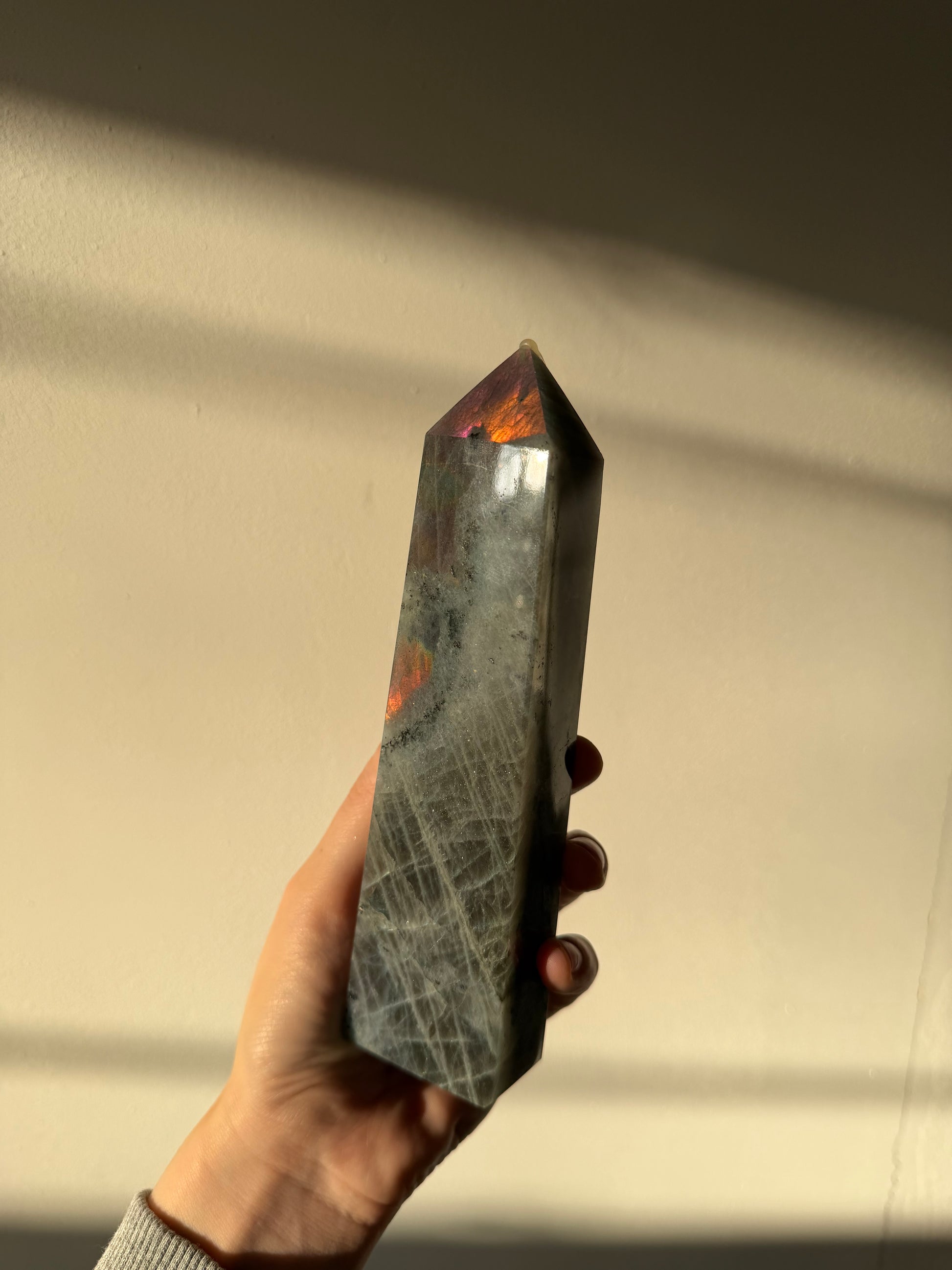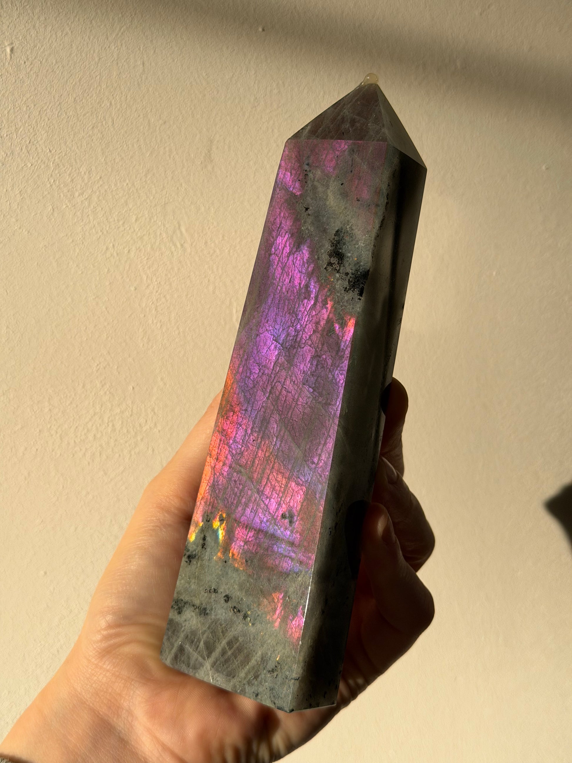 Deze mooie toren van Labradoriet is een echte eyecatcher in je interieur. Zet haar vooral in het licht neer zodat haar prachtige flash tevoorschijn komt!