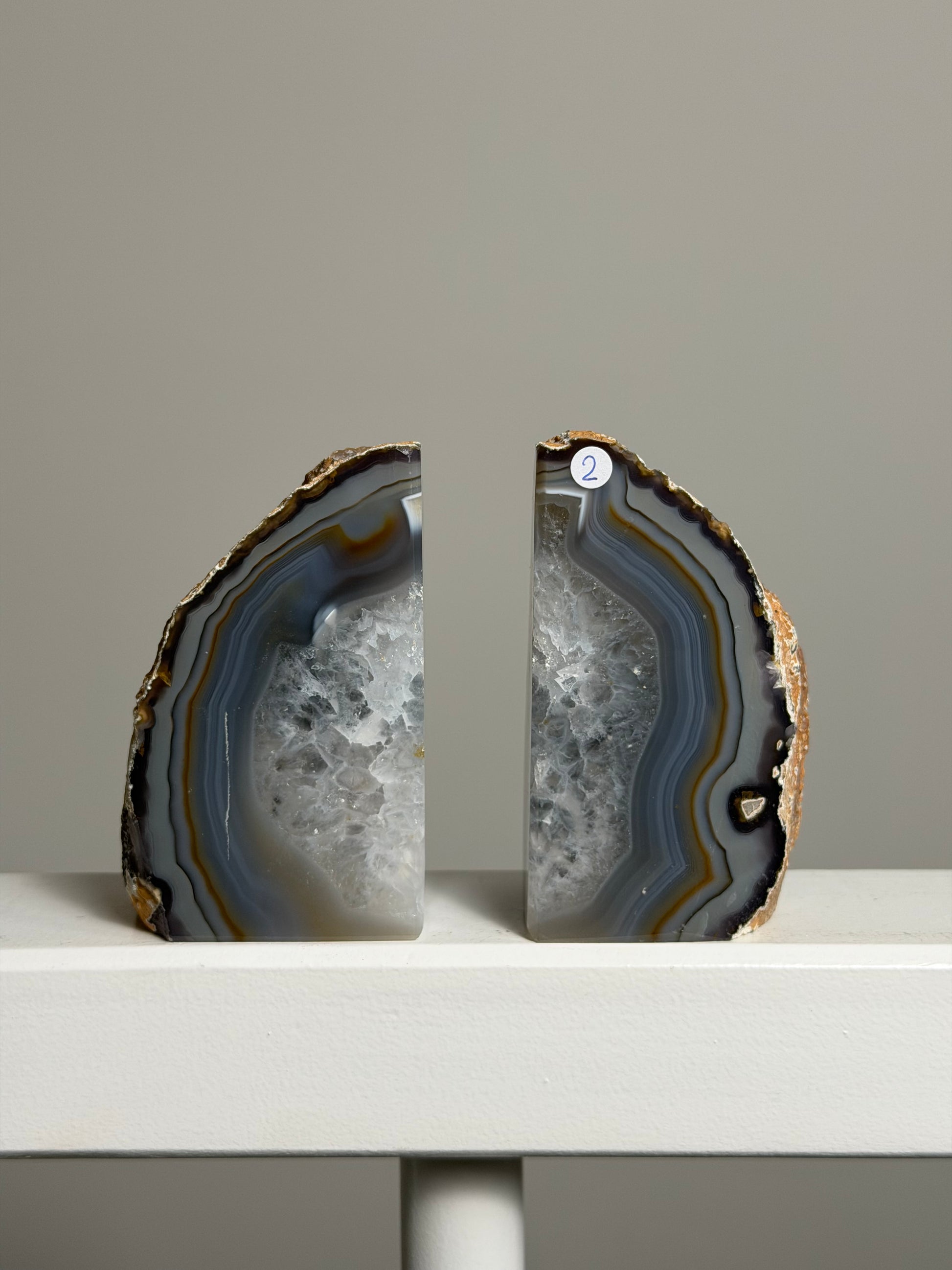 Het originele stuk is doormidden gesplitst, waardoor je twee helften krijgt die samen een set vormen. Je kunt ze op verschillende manieren neerzetten, perfect om jouw favoriete boeken, tijdschriften of kristallencollectie mooi te presenteren.