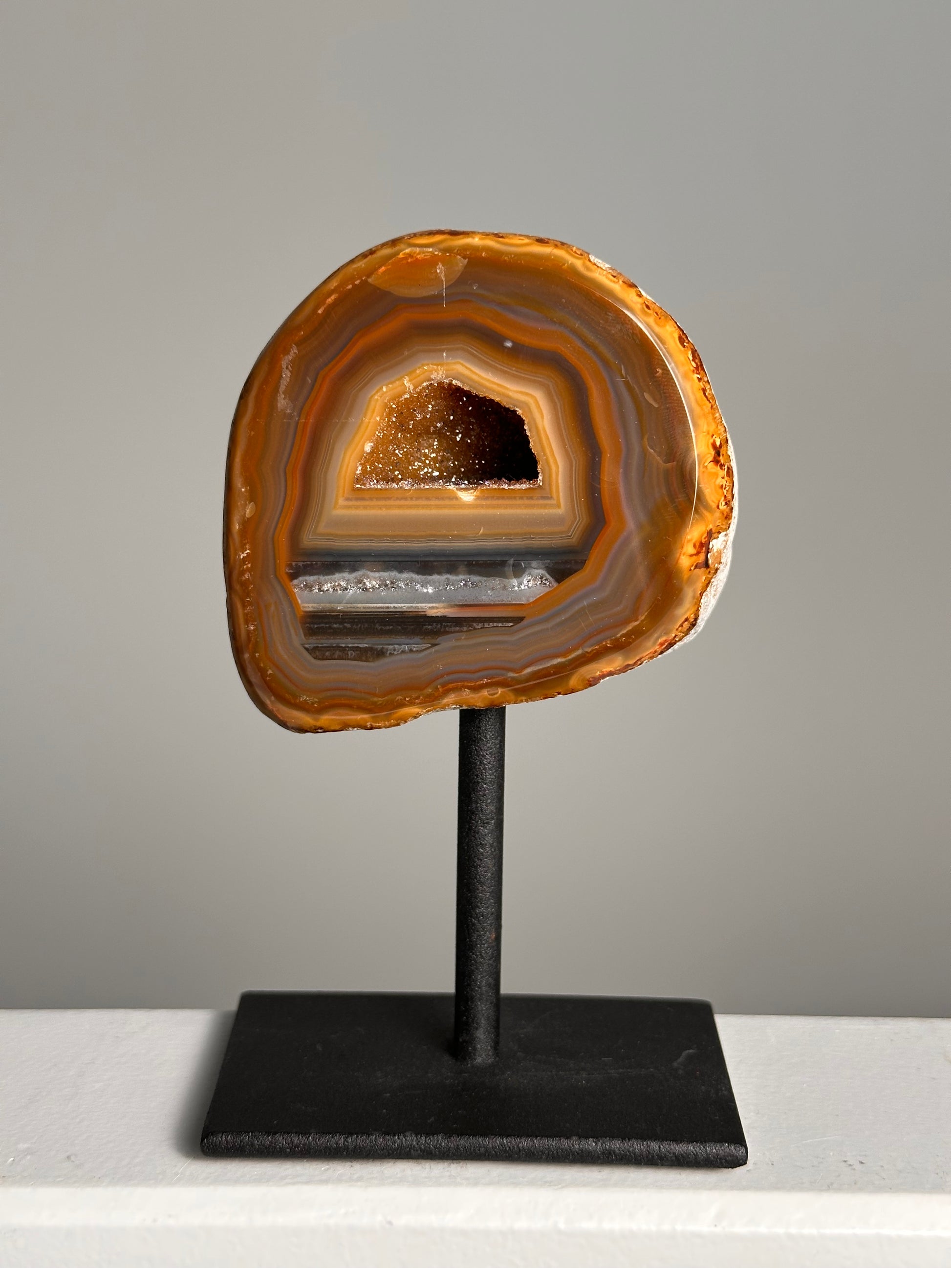 Een agaat op standaard is meer dan een decoratiestuk,  het is een stukje kunst. De stevige metalen voet zorgt ervoor dat je haar op elke plek kunt neerzetten. Plaats haar bij een raam of onder een zachte lamp en laat het licht haar natuurlijke patronen tot leven brengen.