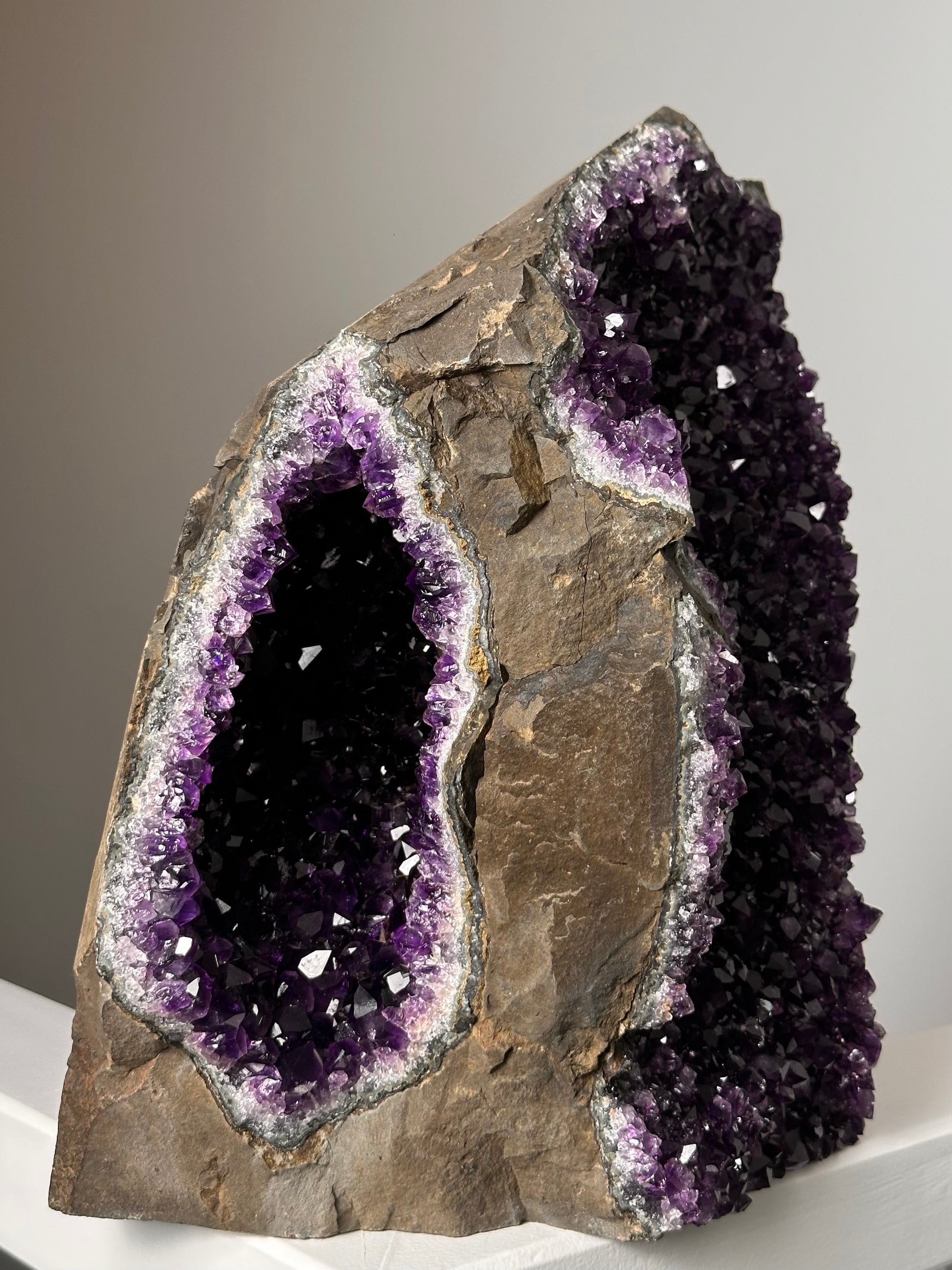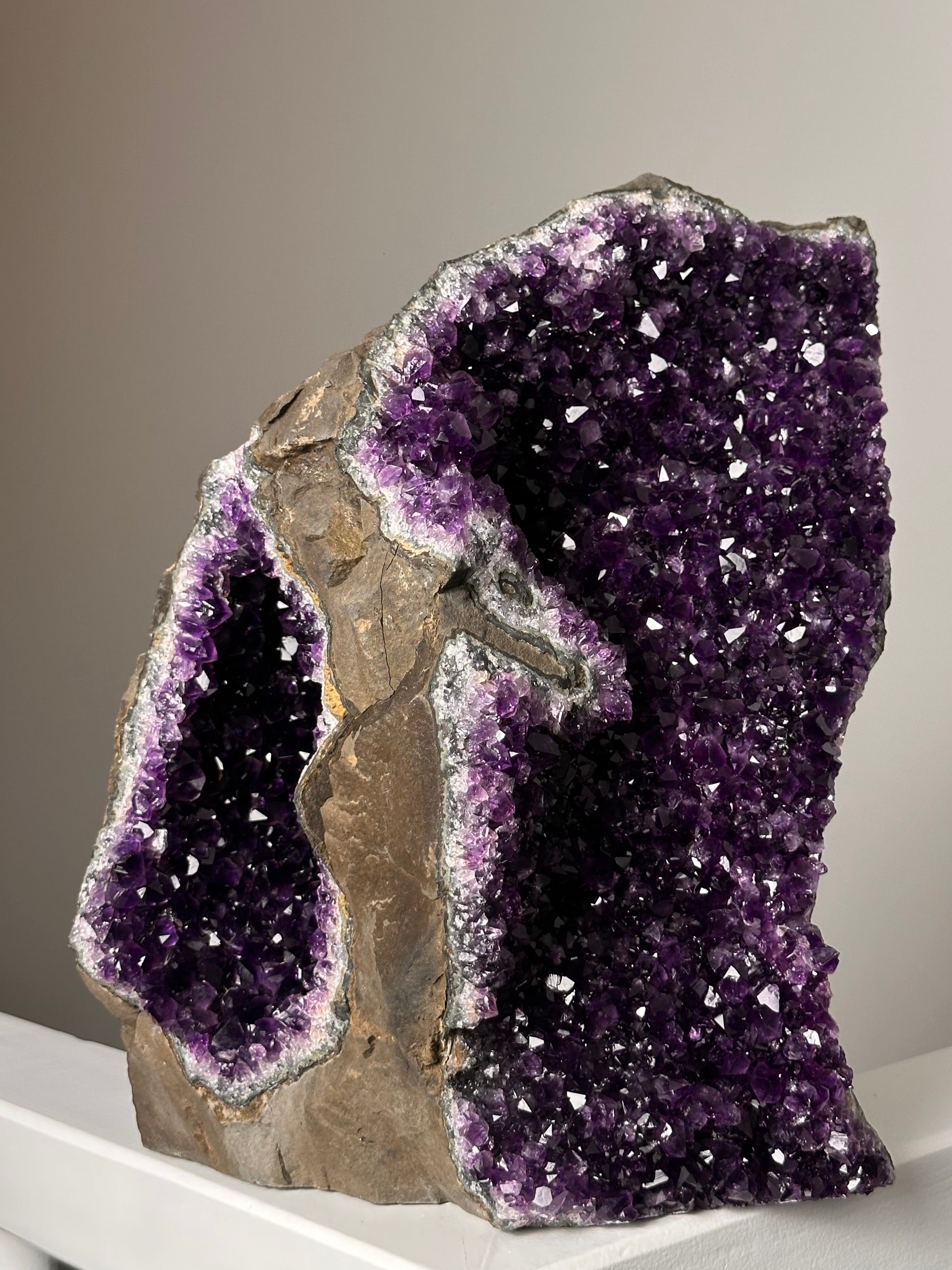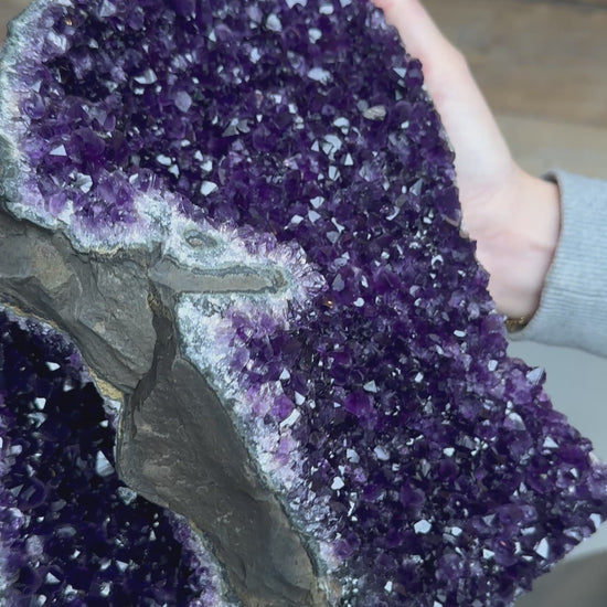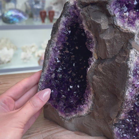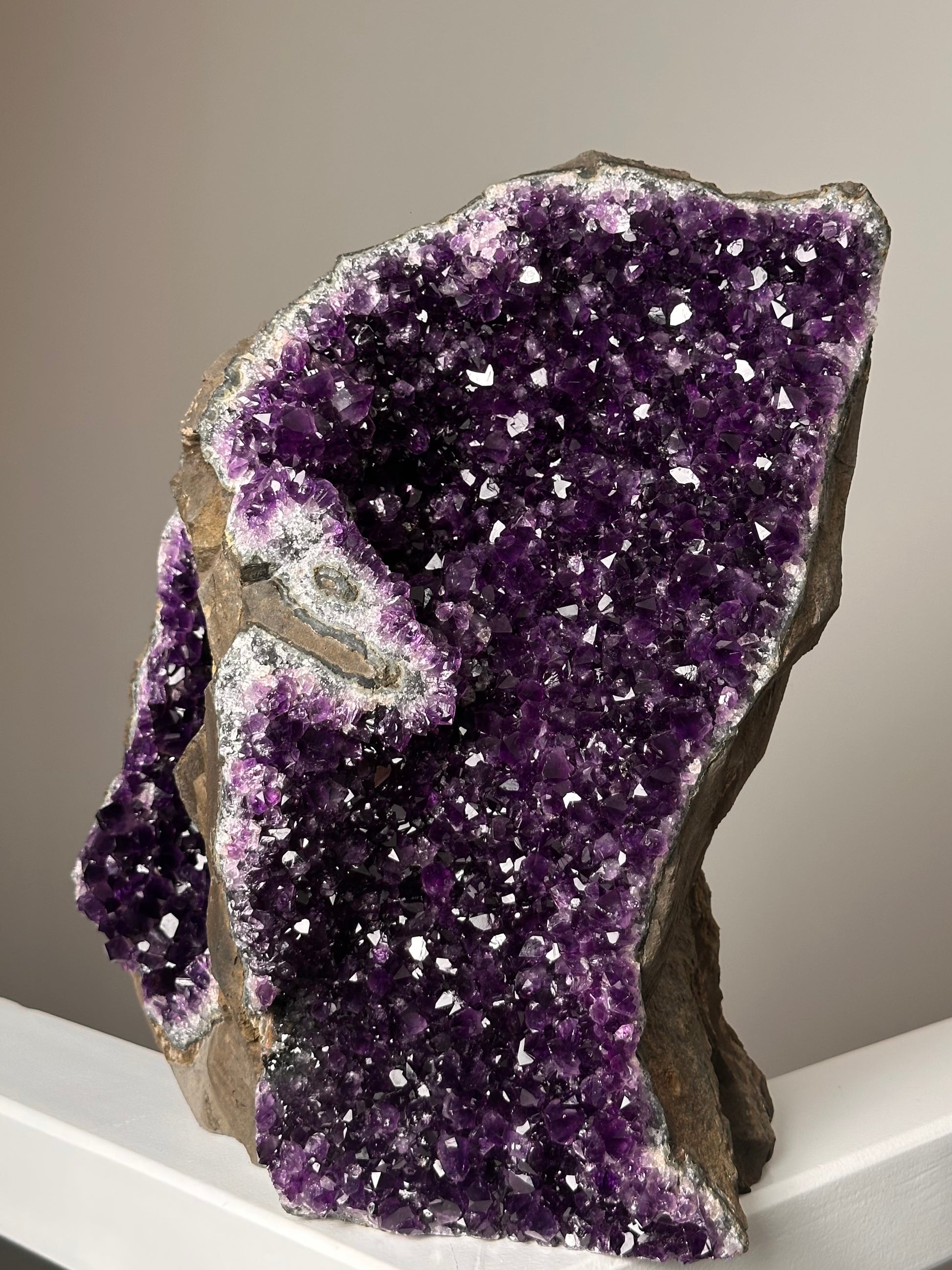 Door de glad gezaagde onderzijde kan deze prachtige Amethist zelfstandig staan, en kun je hem mooi neerzetten in de ruimte.