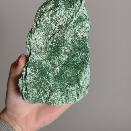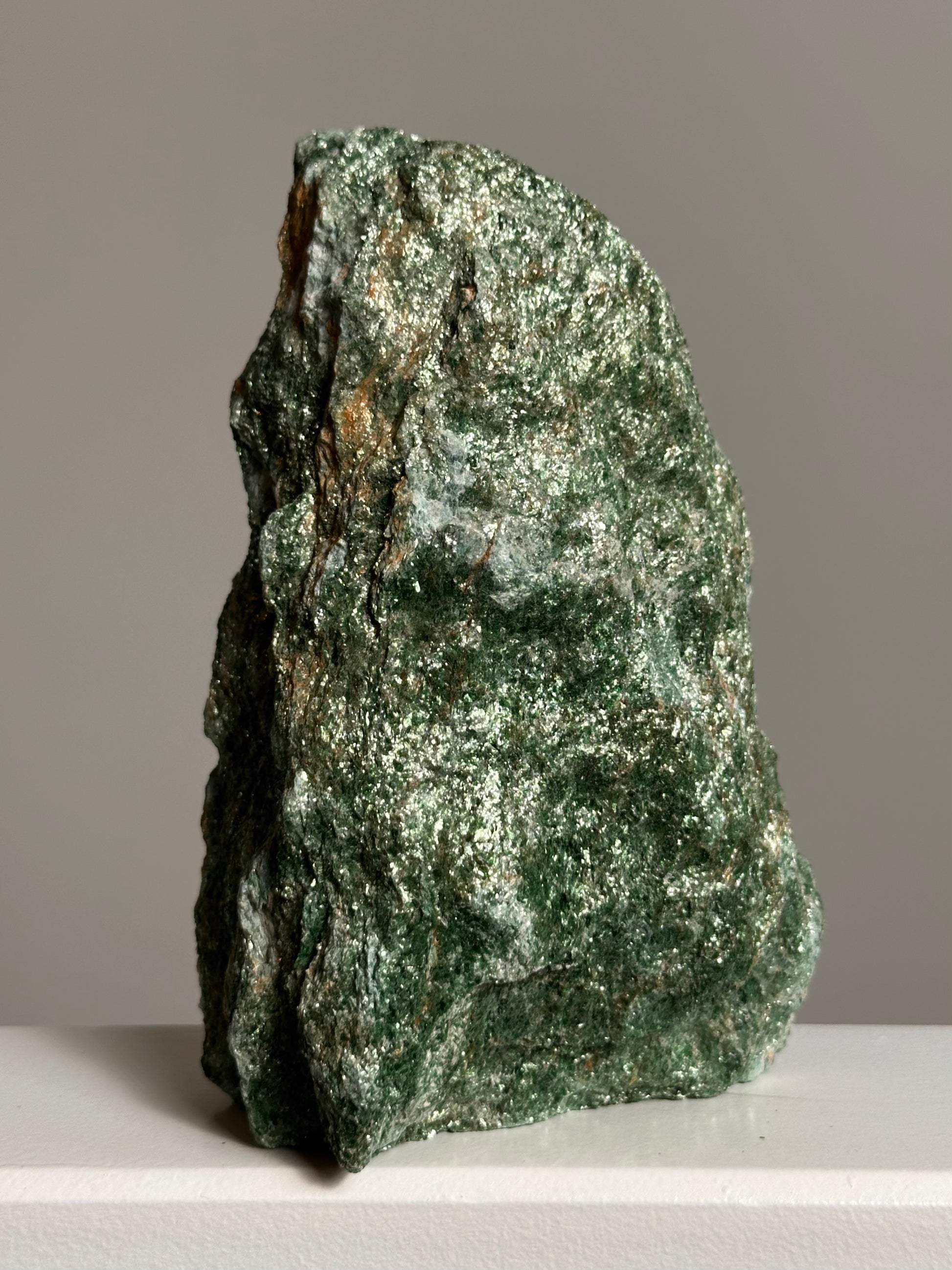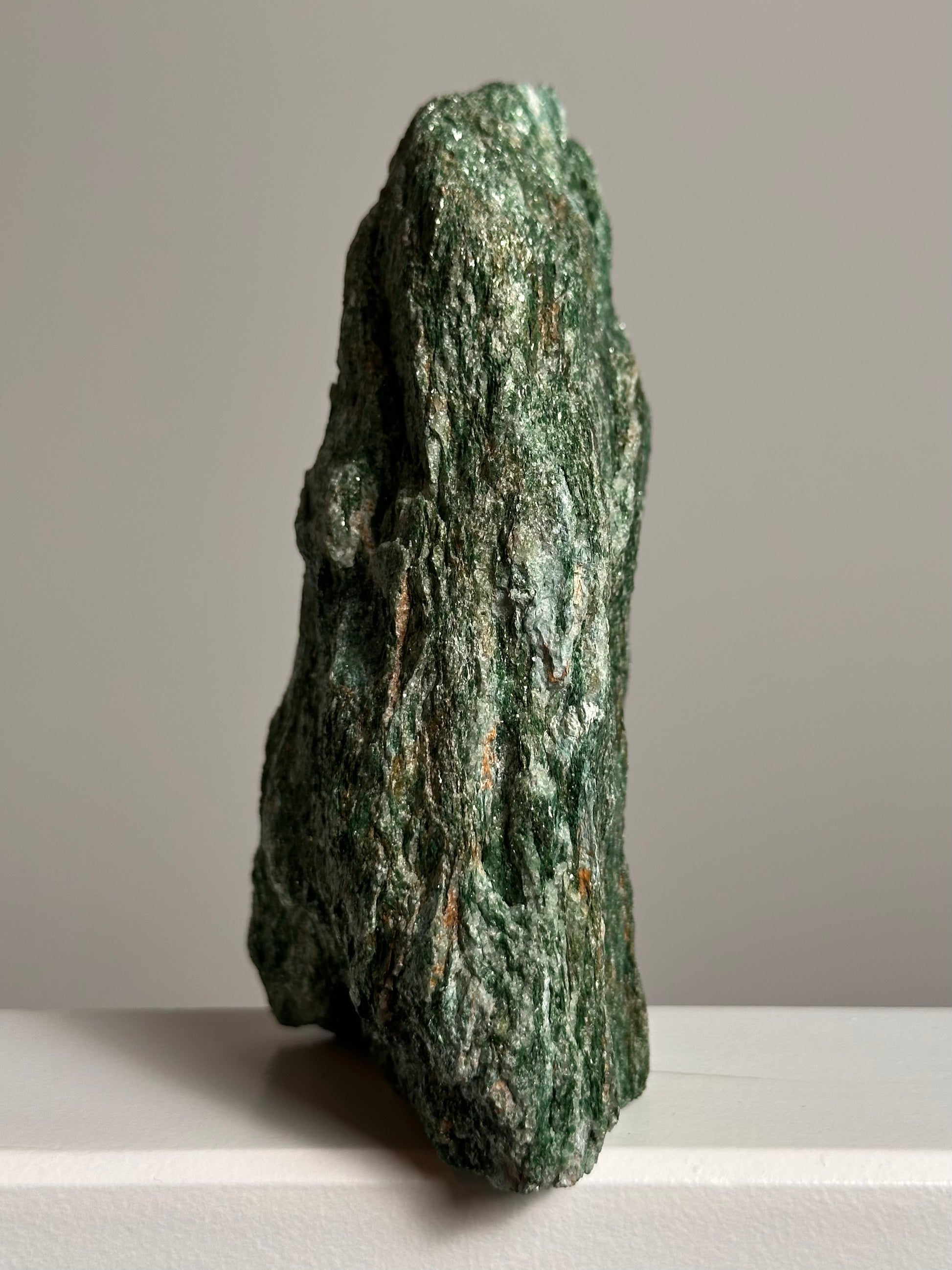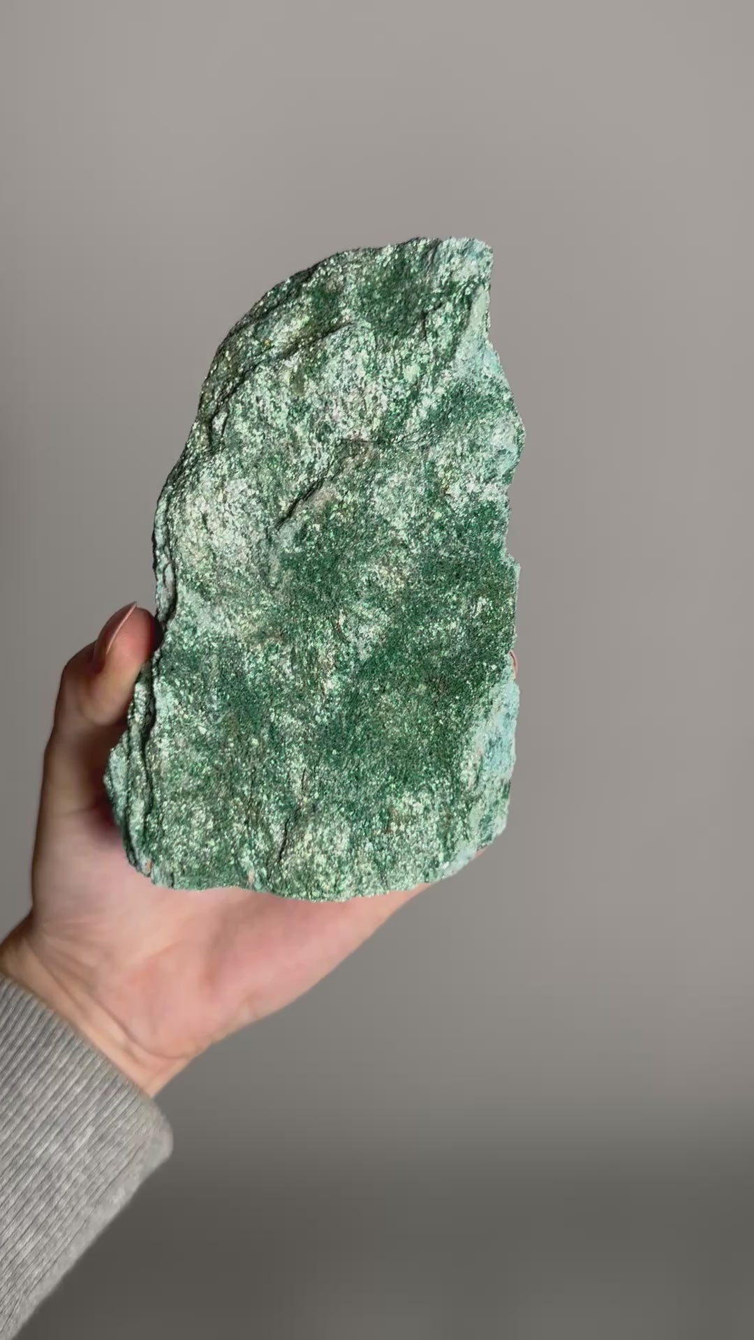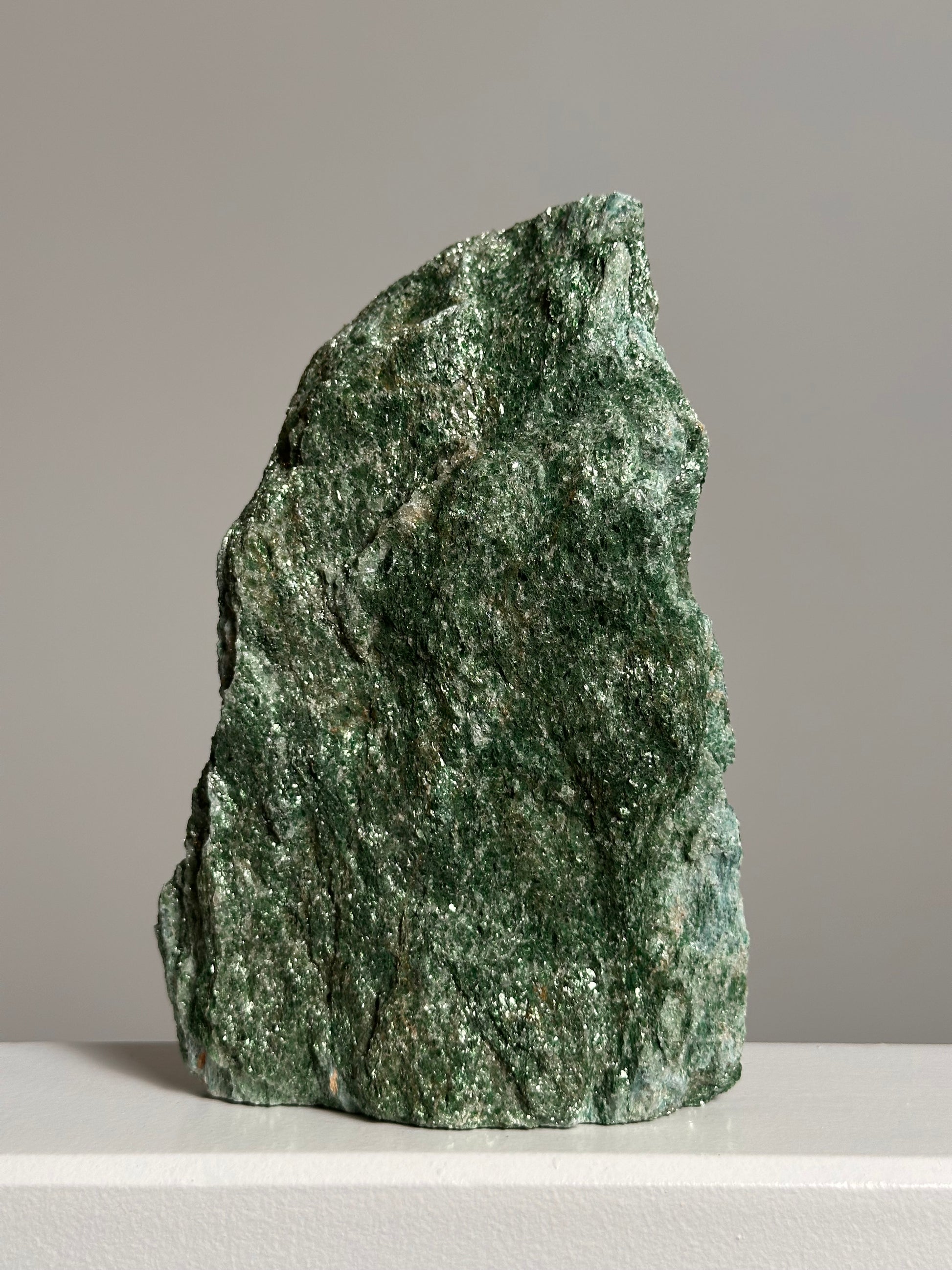 Dit Fuchsiet standvlak is volledig natuurlijk en onbewerkt, waardoor haar sprankelende groene kristallen in hun natuurlijke vorm zichtbaar blijven. Dankzij haar platte onderzijde staat ze stevig en brengt ze een magie in elke ruimte. Plaats haar bij een raam of onder een zachte lamp en laat haar glitters tot leven komen.