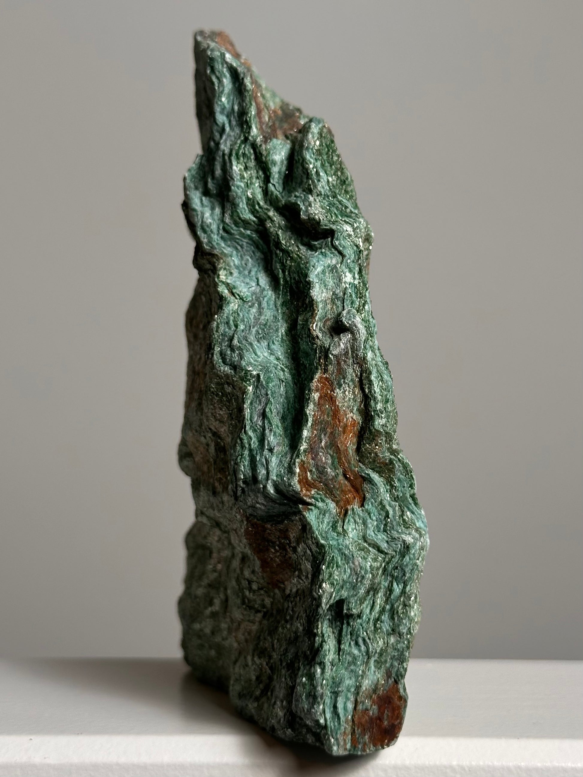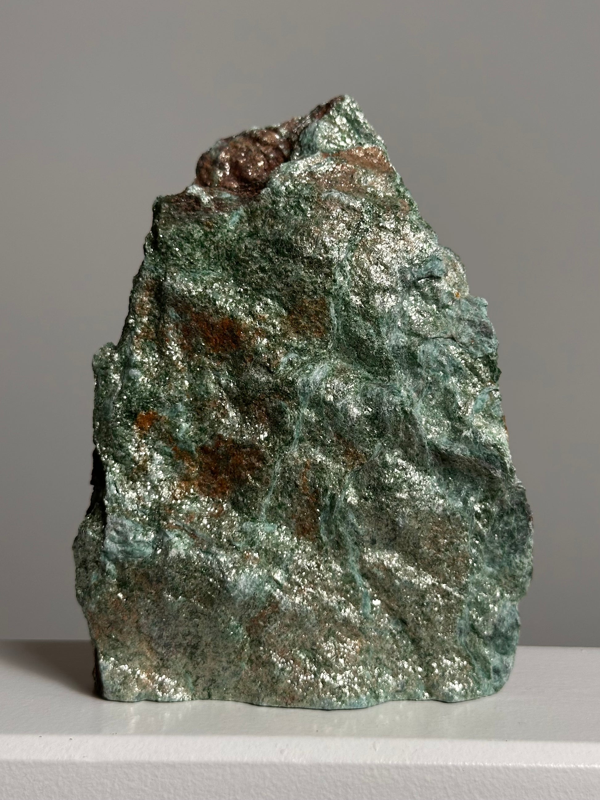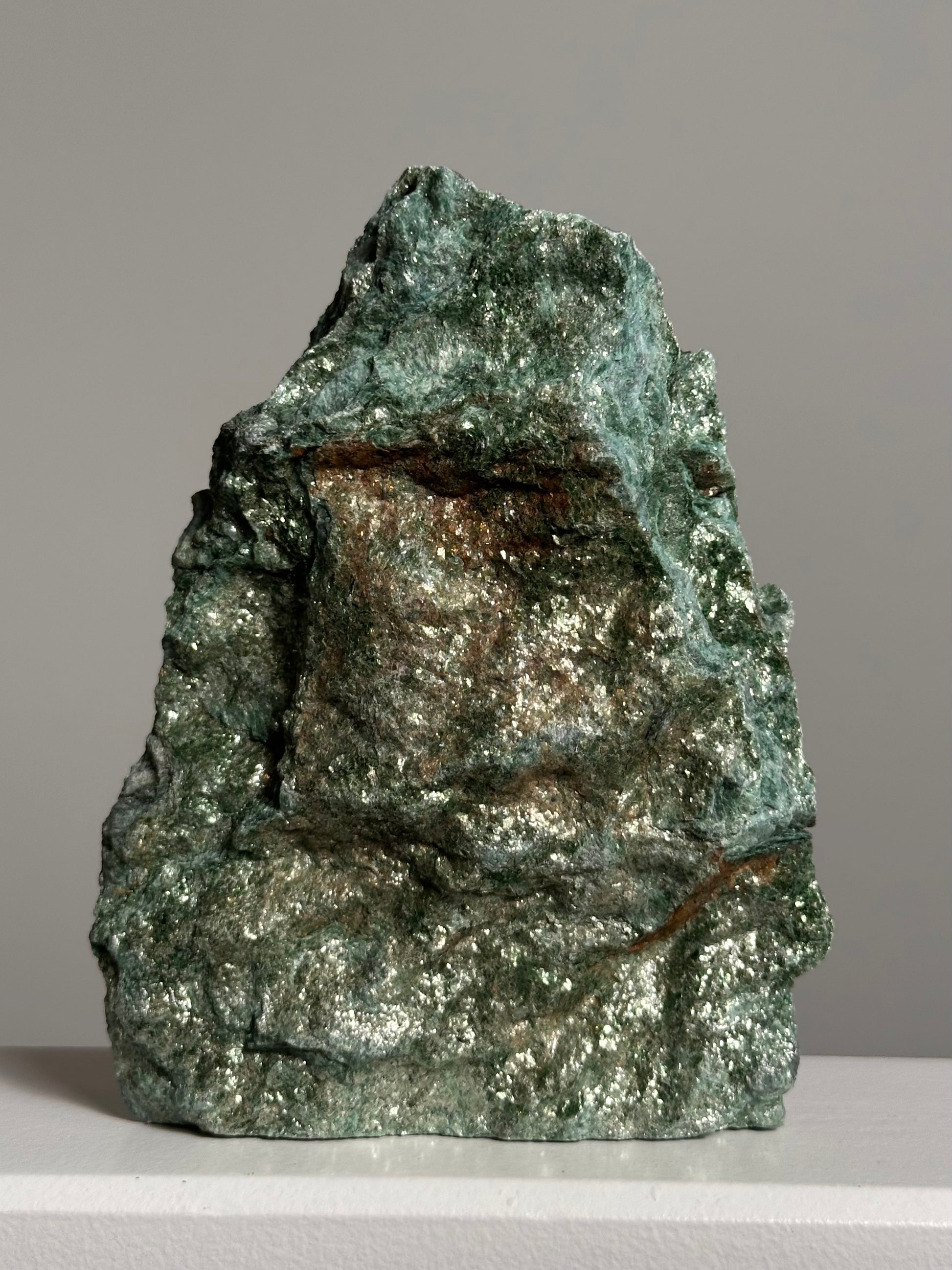 Dit Fuchsiet standvlak is volledig natuurlijk en onbewerkt, waardoor haar sprankelende groene kristallen in hun natuurlijke vorm zichtbaar blijven. Dankzij haar platte onderzijde staat ze stevig en brengt ze een magie in elke ruimte. Plaats haar bij een raam of onder een zachte lamp en laat haar glitters tot leven komen.