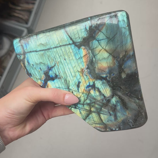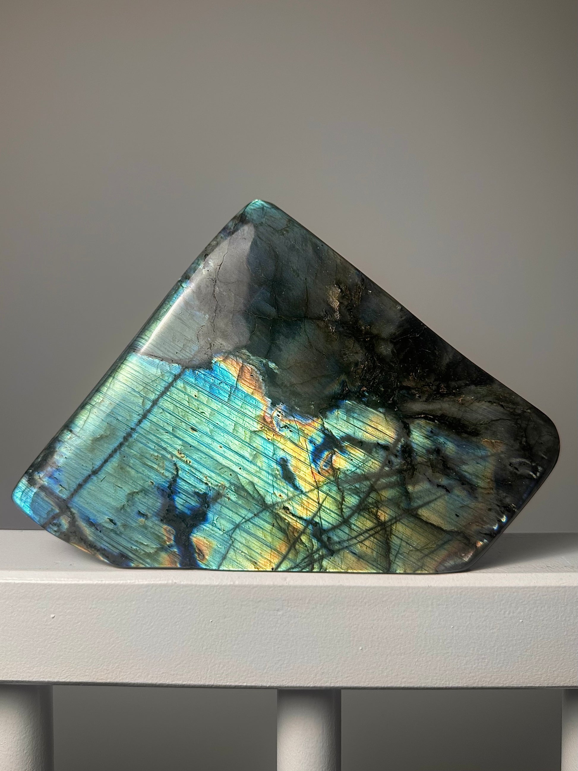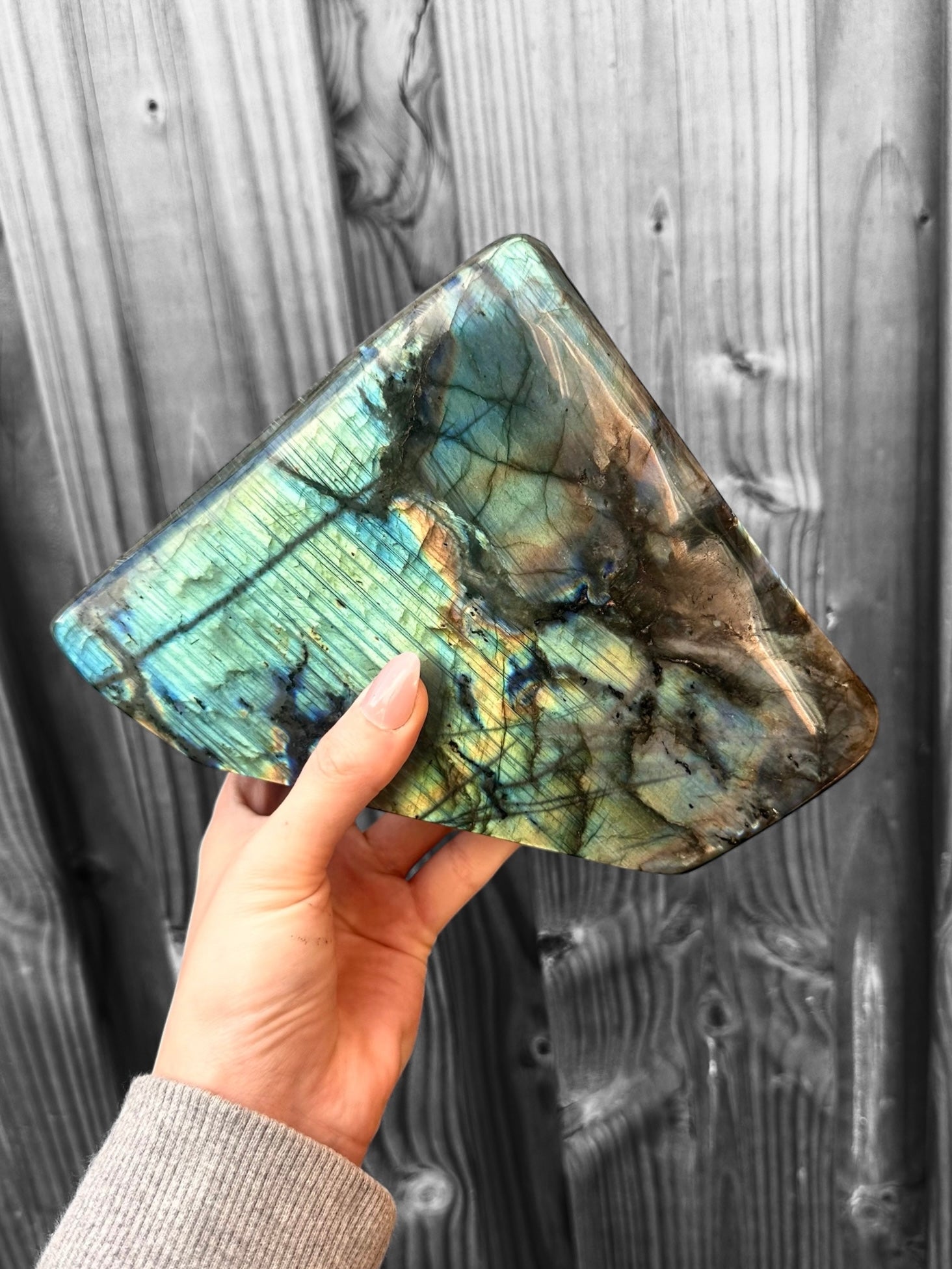 Een labradoriet standvlak is een prachtig stukje natuur. Door haar platte onderzijde staat ze stevig en komt haar mysterieuze glans (ook wel labradorescentie genoemd) prachtig tot leven. Zet haar bij een raam of onder een zachte lamp en ontdek telkens nieuwe kleuren die dansen in het licht.