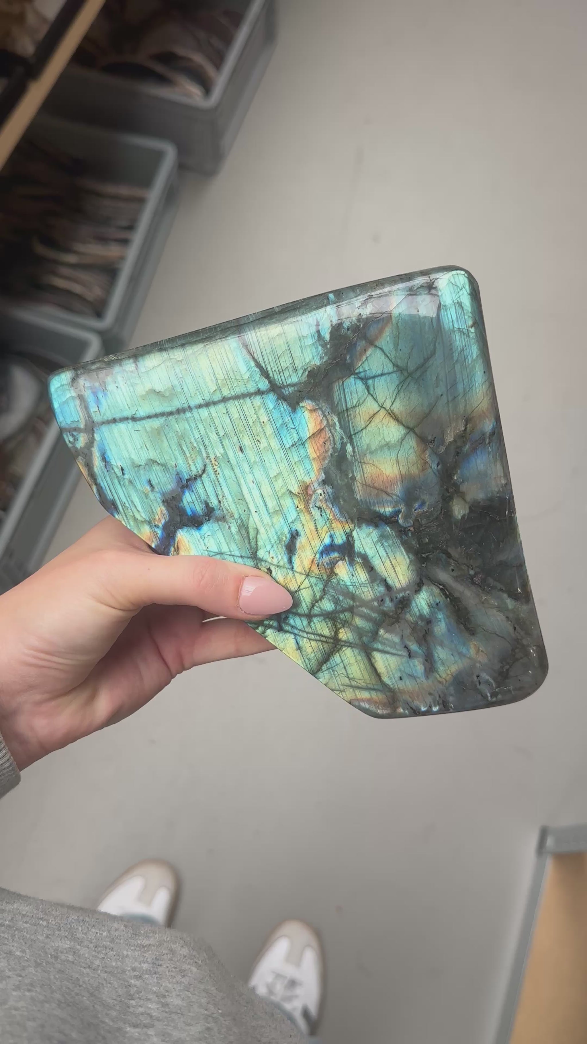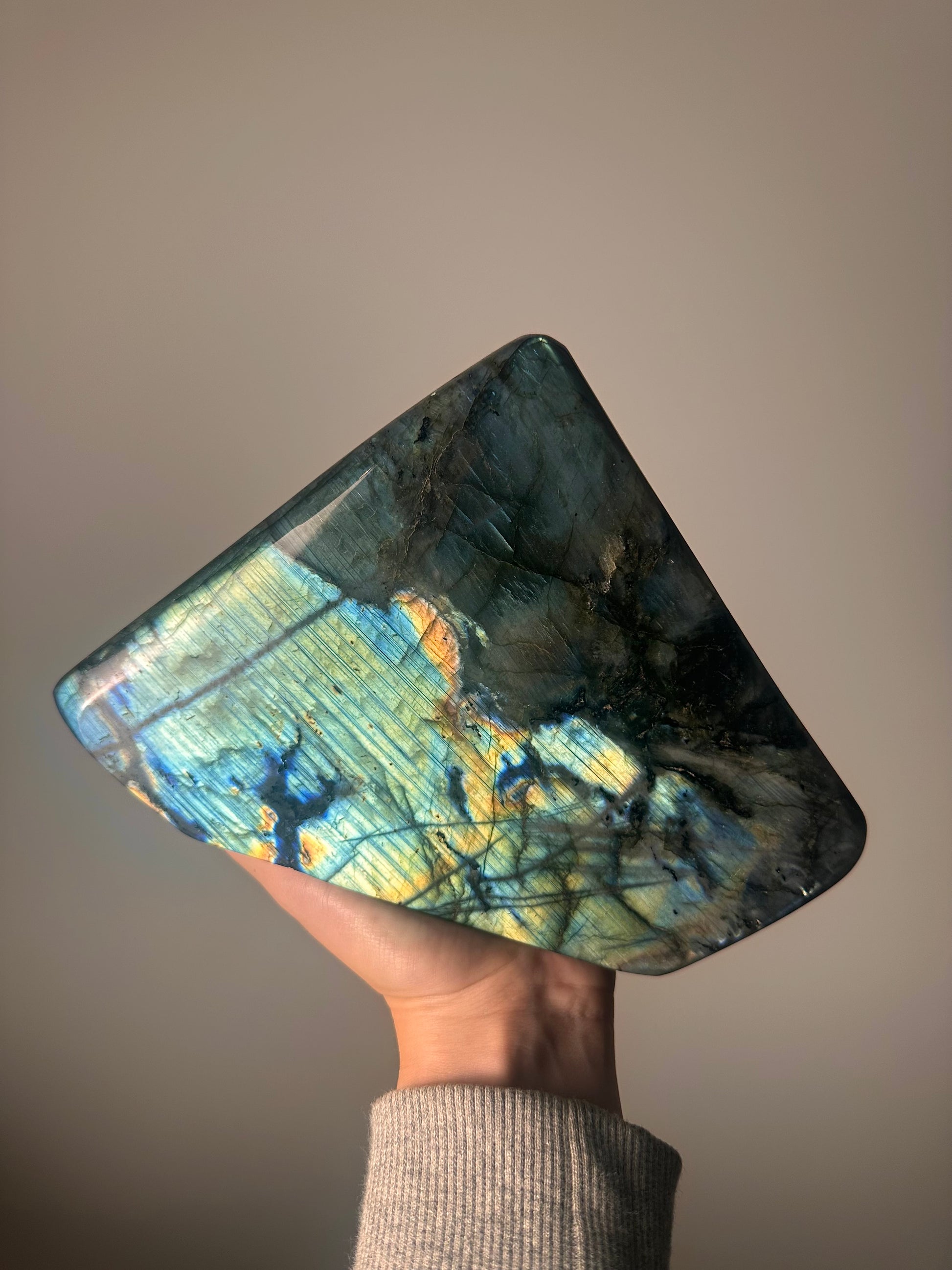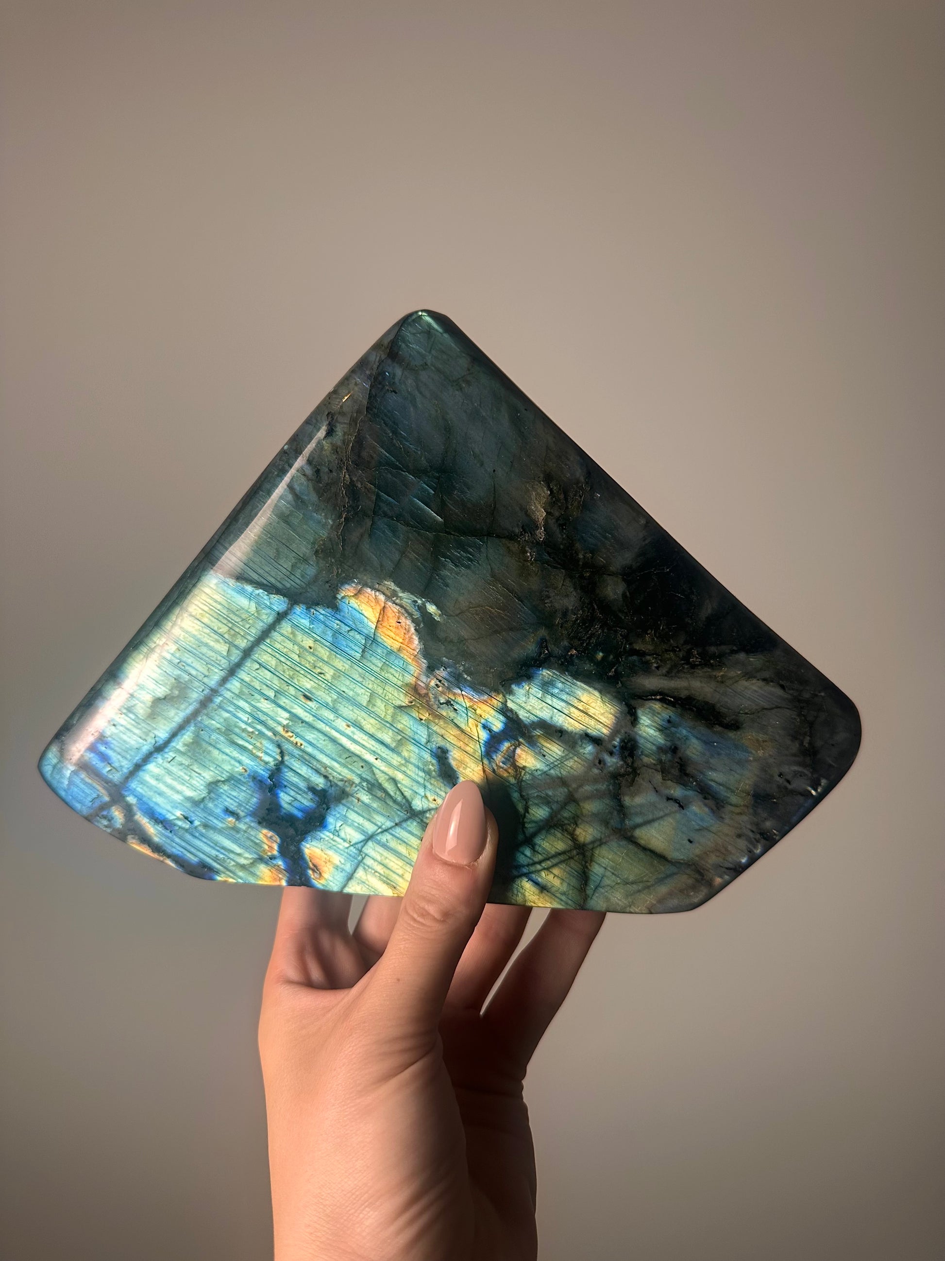 Een labradoriet standvlak is een prachtig stukje natuur. Door haar platte onderzijde staat ze stevig en komt haar mysterieuze glans (ook wel labradorescentie genoemd) prachtig tot leven. Zet haar bij een raam of onder een zachte lamp en ontdek telkens nieuwe kleuren die dansen in het licht.