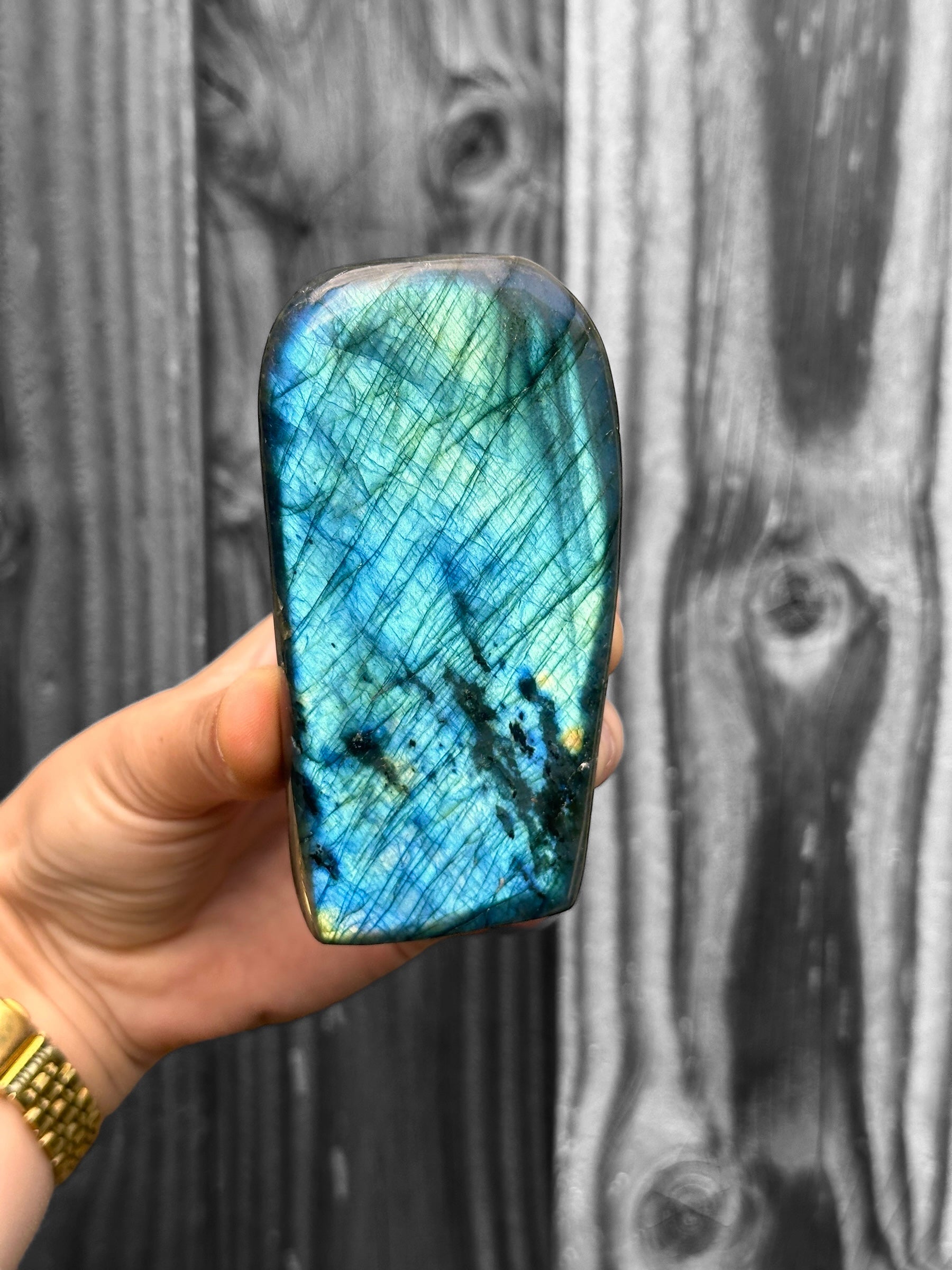 Een labradoriet standvlak is een prachtig stukje natuur. Door haar platte onderzijde staat ze stevig en komt haar mysterieuze glans (ook wel labradorescentie genoemd) prachtig tot leven. Zet haar bij een raam of onder een zachte lamp en ontdek telkens nieuwe kleuren die dansen in het licht.