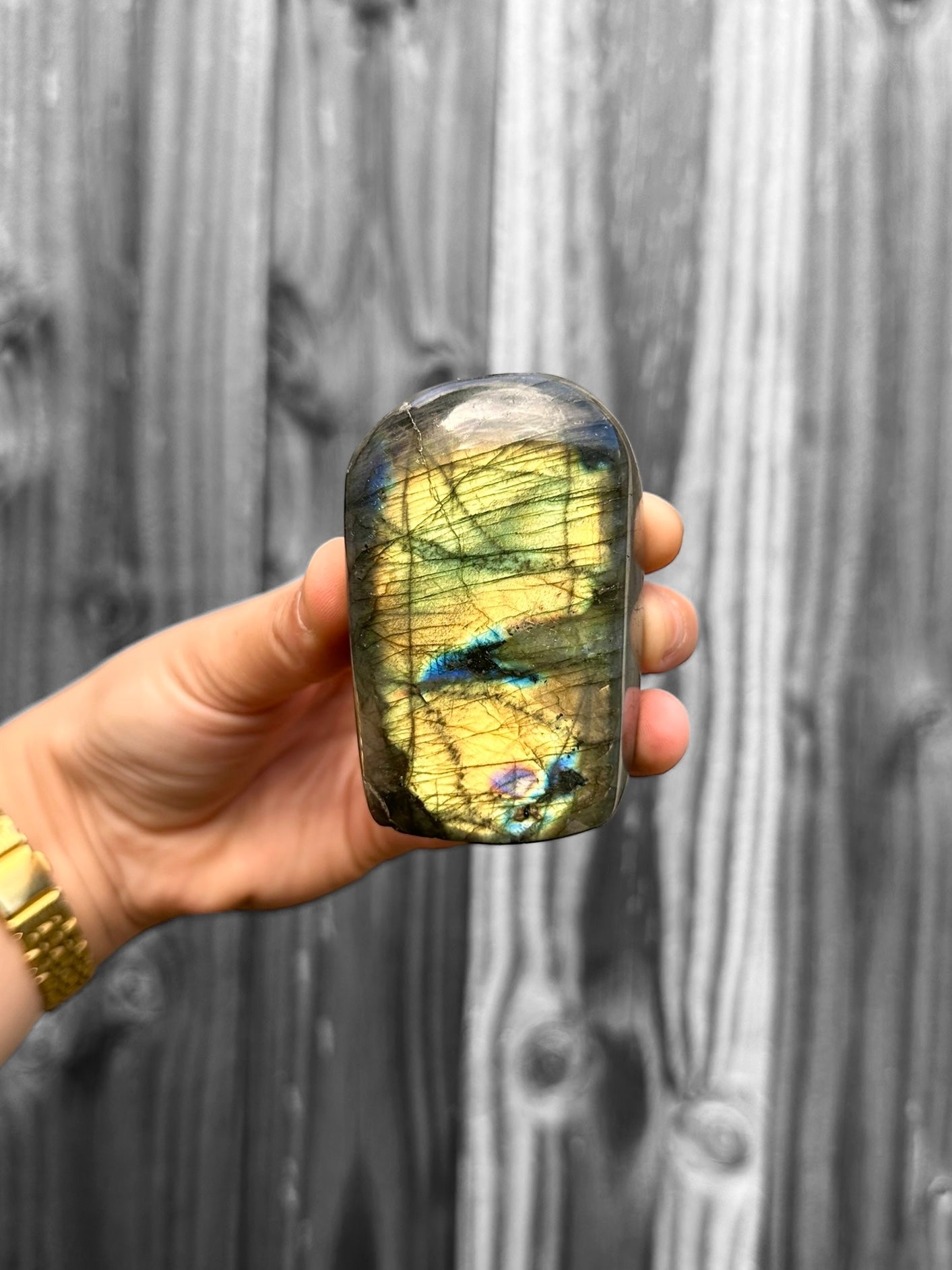 Een labradoriet standvlak is een prachtig stukje natuur. Door haar platte onderzijde staat ze stevig en komt haar mysterieuze glans (ook wel labradorescentie genoemd) prachtig tot leven. Zet haar bij een raam of onder een zachte lamp en ontdek telkens nieuwe kleuren die dansen in het licht.
