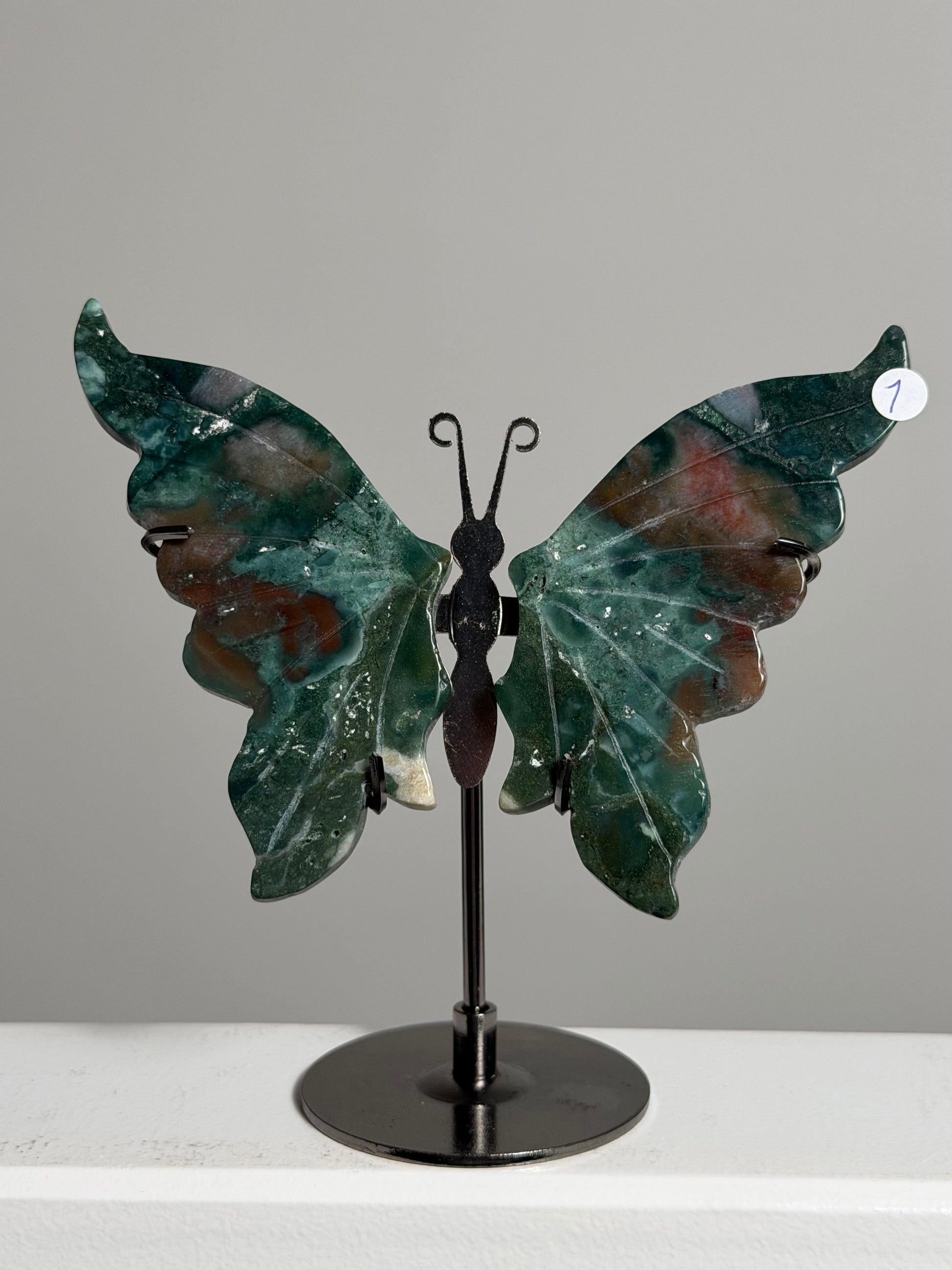 Prachtige vlinder met vleugels van gepolijste Mosagaat. De stevige metalen voet zorgt ervoor dat je haar op elke plek kunt neerzetten. Plaats haar bij een raam of onder een zachte lamp en laat het licht haar natuurlijke patronen tot leven brengen.