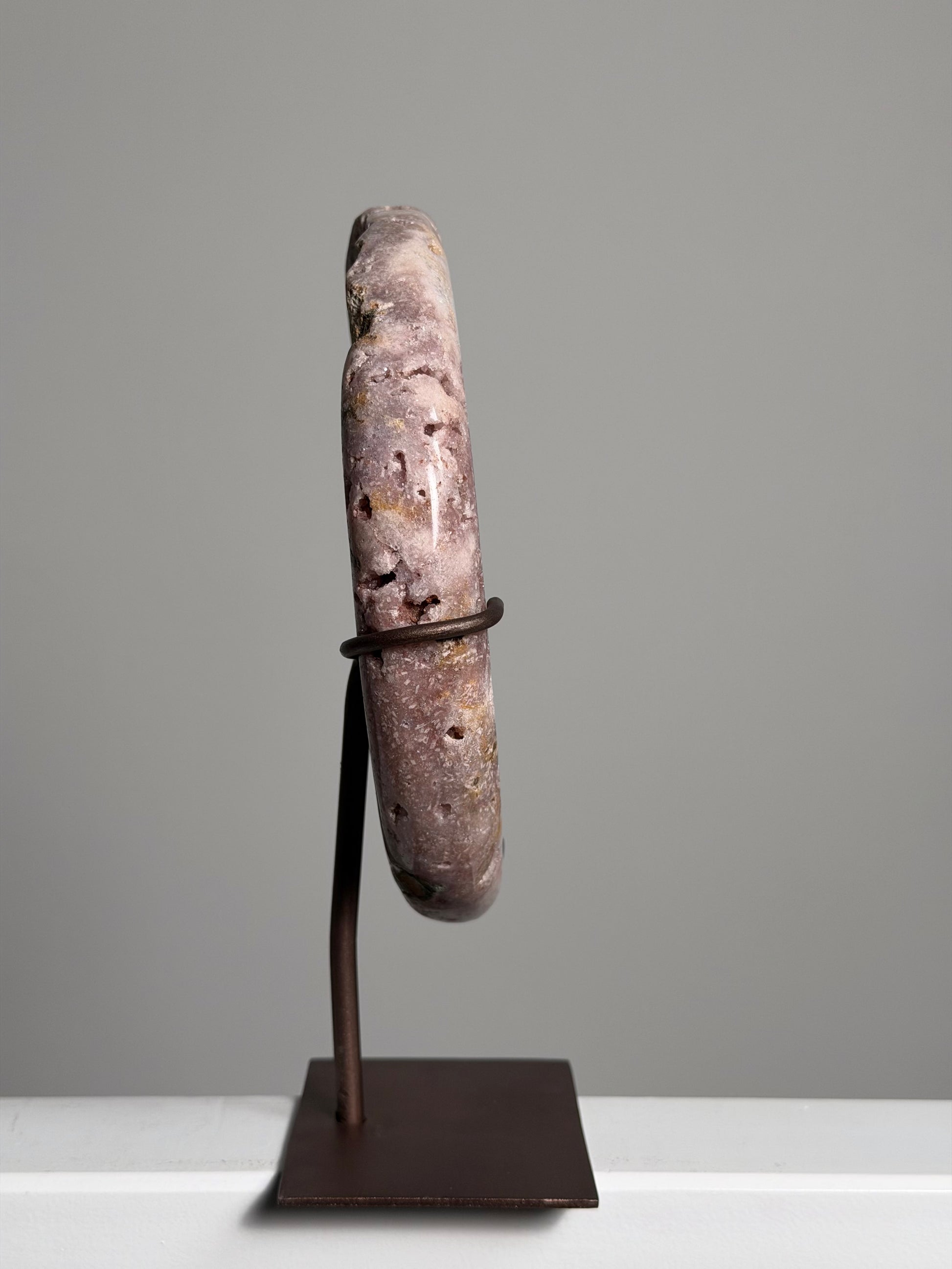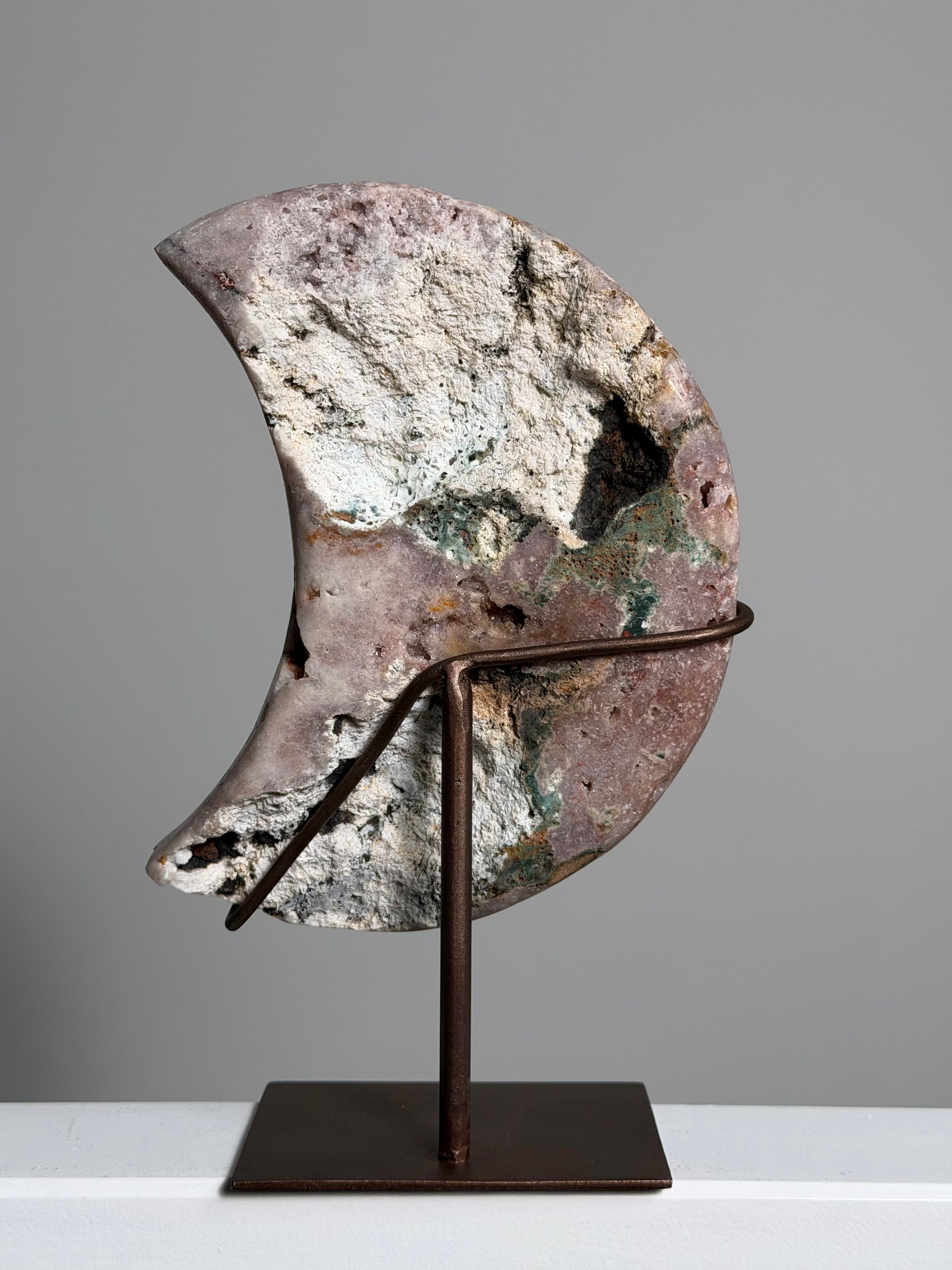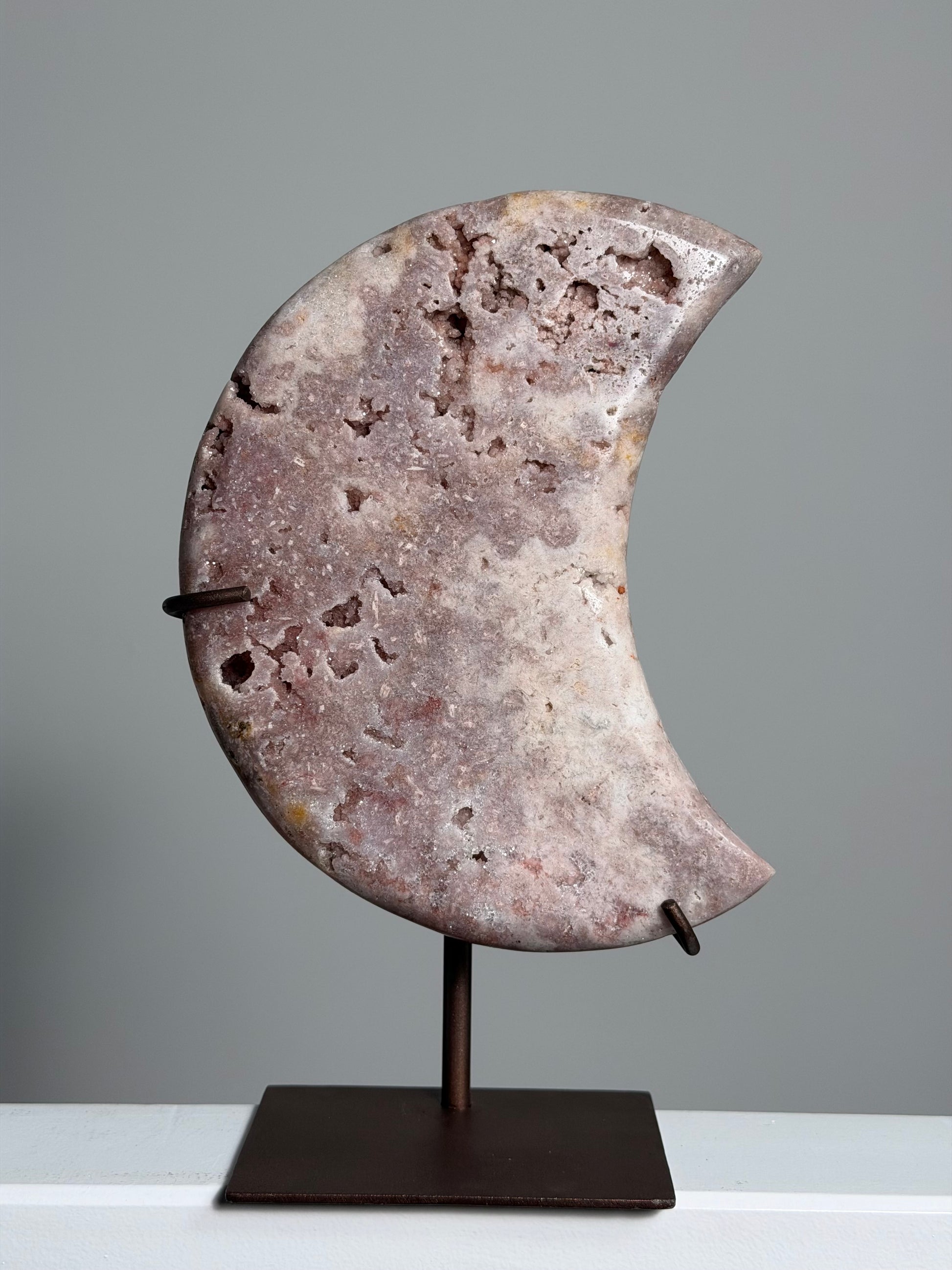 Een Roze Amethist Maan op standaard is een bijzondere verschijning. Ze combineert de kalmerende kracht van amethist met een warme, vrouwelijke uitstraling. De steen toont zachte roze tot lavendeltinten, vaak met kristallijne glinsteringen. Op een stevige standaard komt ze prachtig tot haar recht, als decoratie én als energetische ondersteuning.