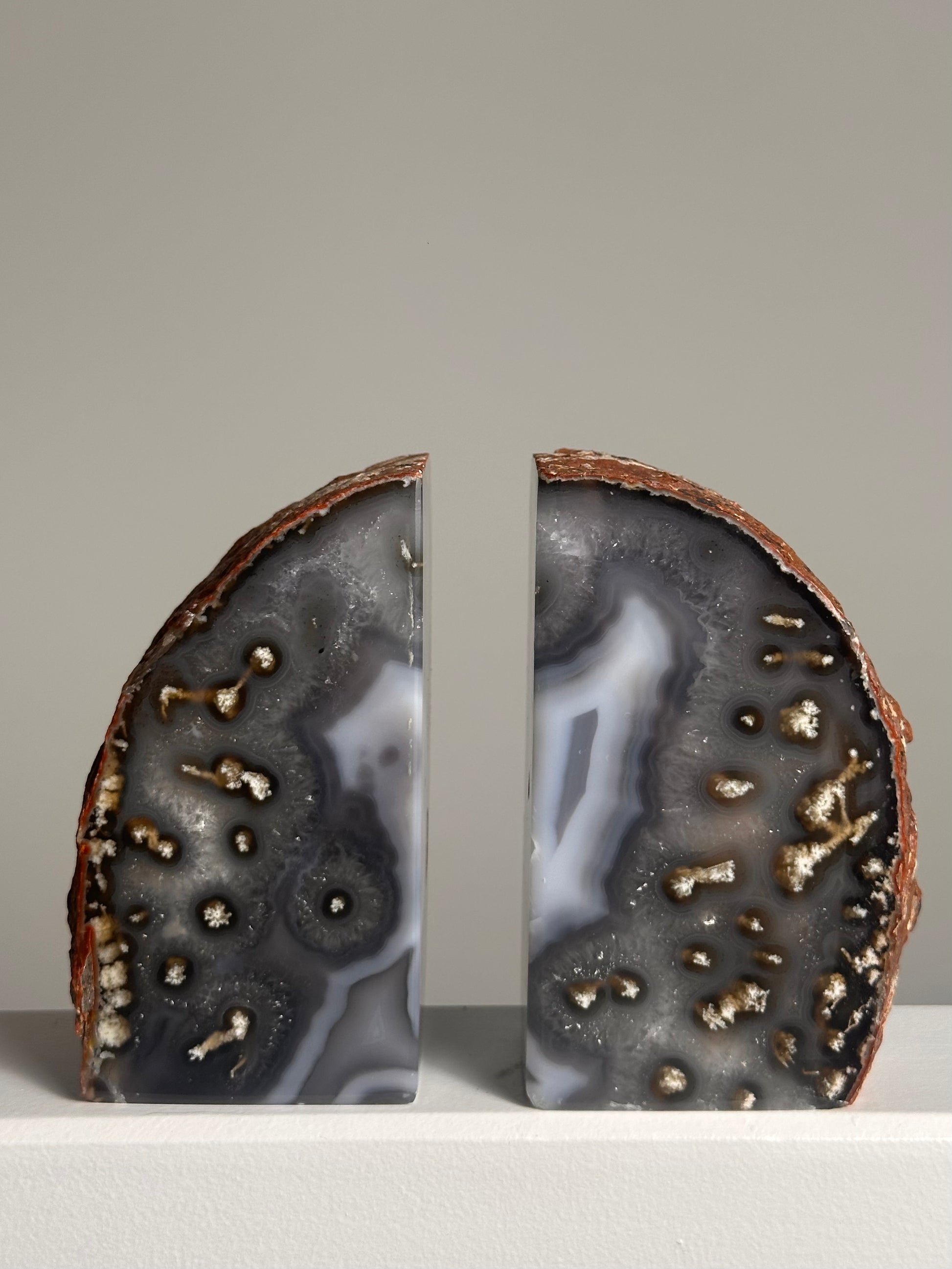 Het originele stuk is doormidden gesplitst, waardoor je twee helften krijgt die samen een set vormen. Je kunt ze op verschillende manieren neerzetten, perfect om jouw favoriete boeken, tijdschriften of kristallencollectie mooi te presenteren. 📚💫