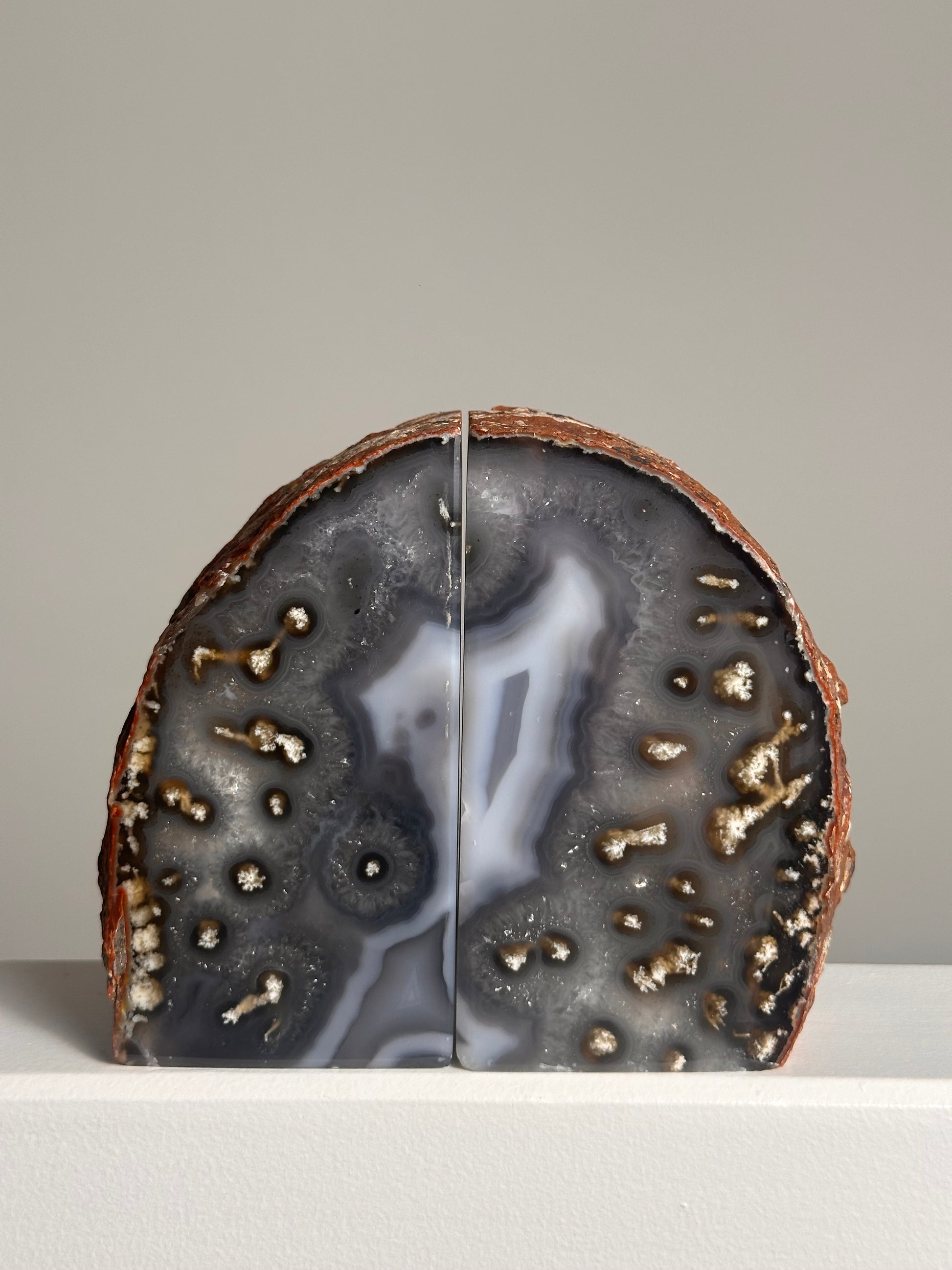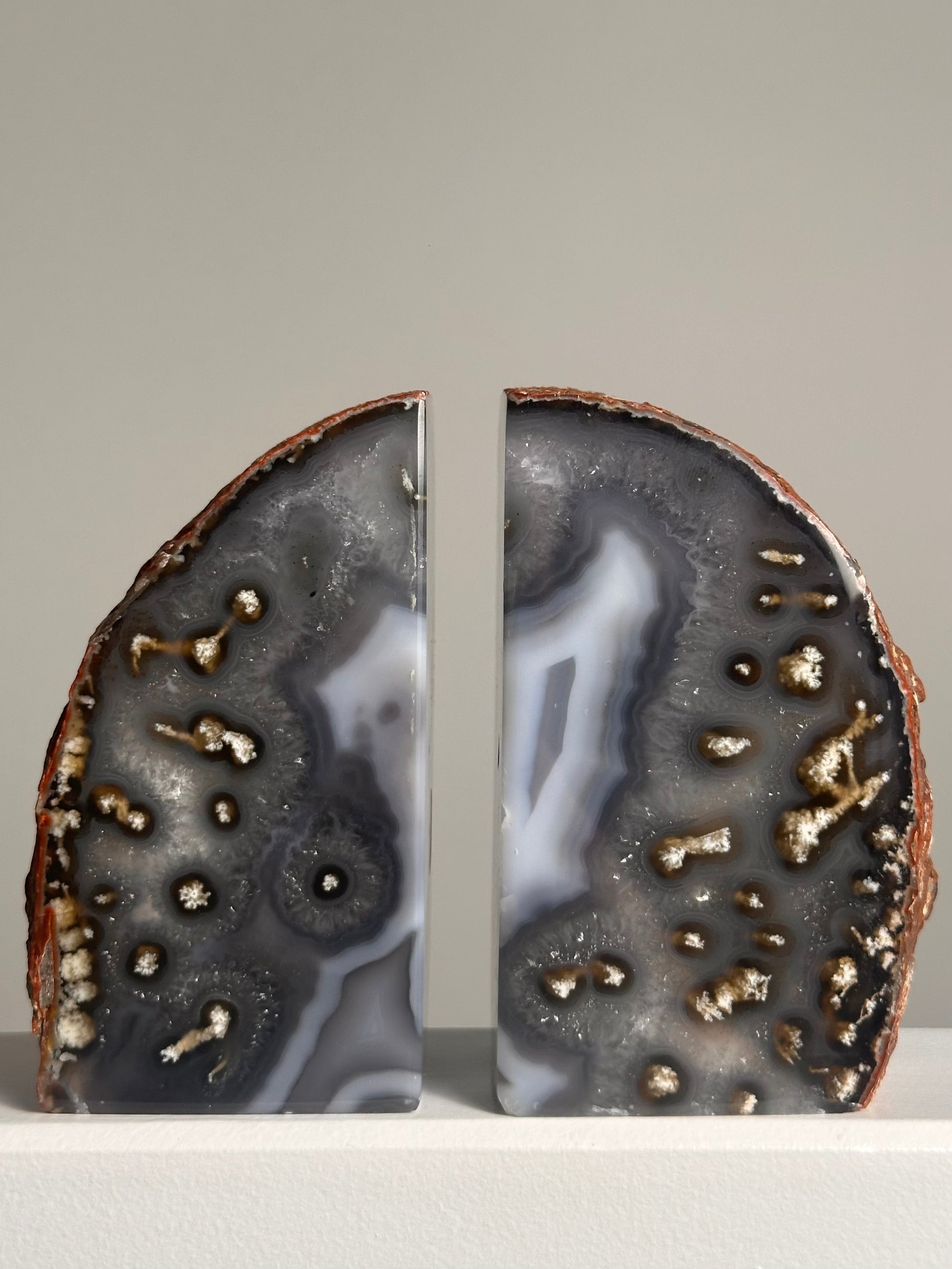 Deze prachtige boekensteun is gemaakt van echte Agaat, een steen die bekendstaat om haar natuurlijke schoonheid en kalmerende energie. Elk stuk is uniek, een klein kunstwerk van de aarde zelf. ✨
