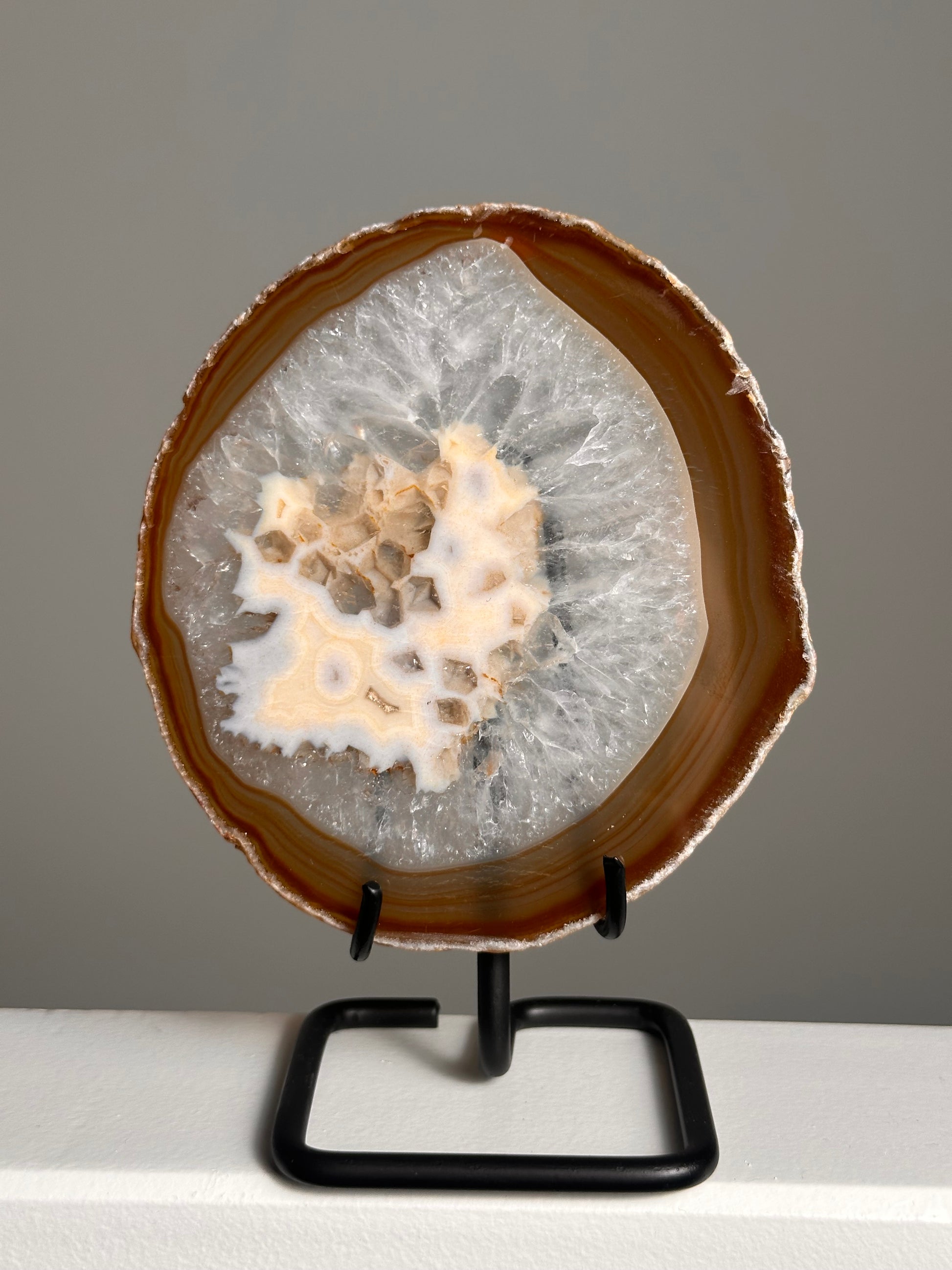 Een agaat schijf is meer dan een decoratiestuk het is een stukje kunst. Je kunt haar combineren met een standaard of een waxinelichthouder waar je de schijf in kunt plaatsen - beide zijn los verkrijgbaar.