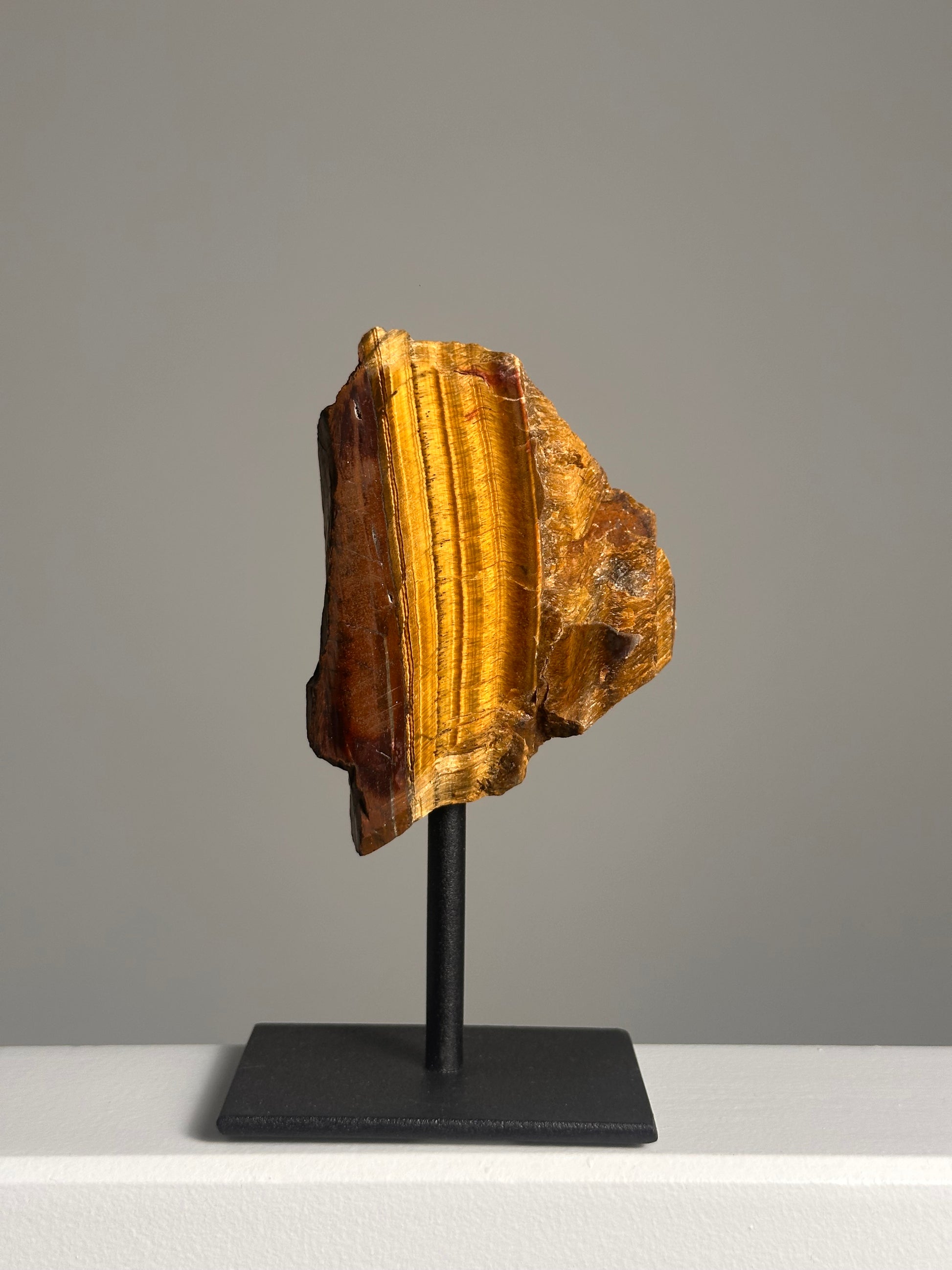 Een Tijgeroog op standaard is meer dan alleen een decoratiestuk, het is een stukje kunst. De ruwe achterkant laat haar oorsprong zien, terwijl de gepolijste voorkant haar goudbruine gloed toont. ✨